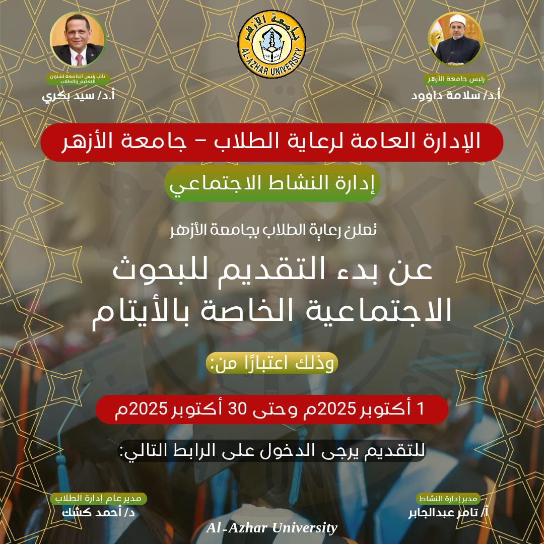 قراءة المزيدرعاية الطلاب بجامعة الأزهر تعلن عن بدء التقديم للبحوث الاجتماعية الخاصة بالأيتام
